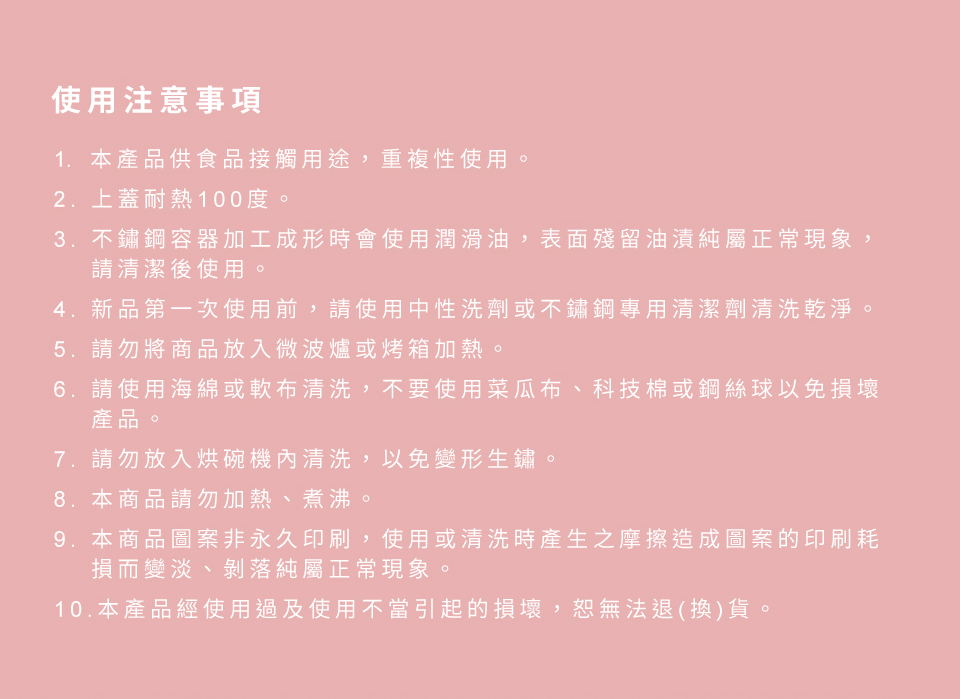 2.請使用海綿或軟布清洗,不要使用菜瓜布、科技棉或鋼絲球以免損壞產品。
